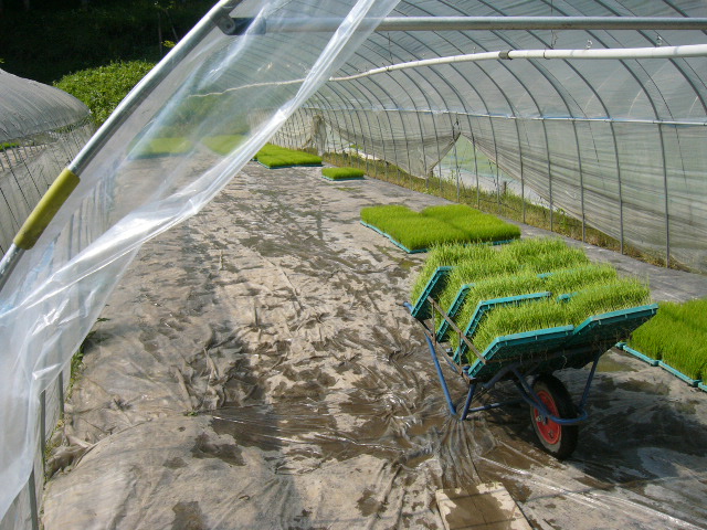 こぬかを、一定量ハウスの中にまんべんなく撒き、