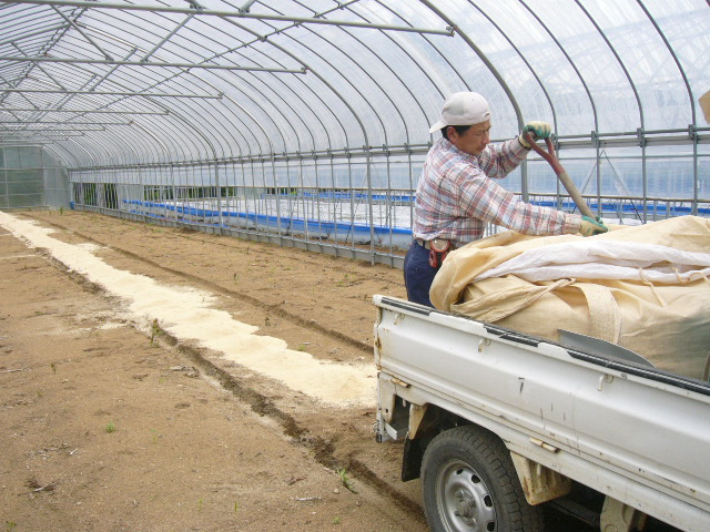 こぬか とか、 ふすま などを、決められた分量をハウス内に撒き、