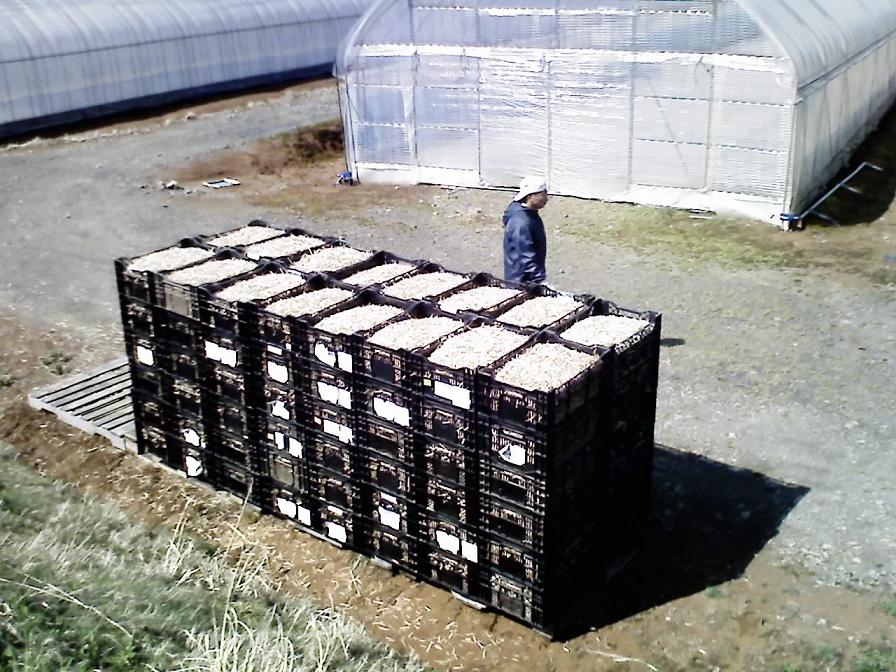 そのわらは、あらかじめ細かく切り刻んで、箱に詰めてハウスの近くにたくさん積んである。
